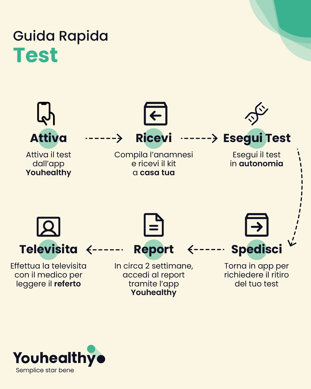Il Test viene eseguito con un tampone buccale attraverso un semplice auto-prelievo di saliva. L’analisi viene effettuata con metodologie innovative che permettono di leggere, all’interno del genoma, quasi un milione di varianti. I risultati sono riportati in un report completo e disponibili entro 30 giorni.